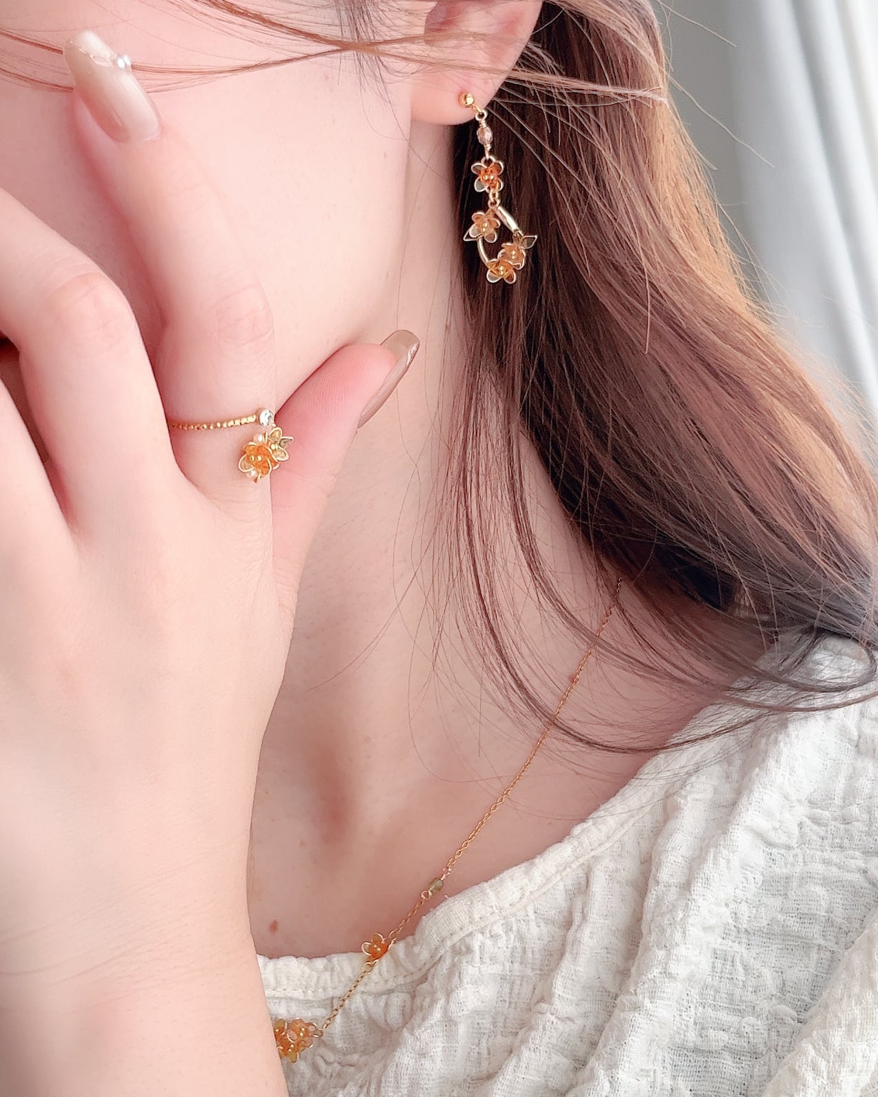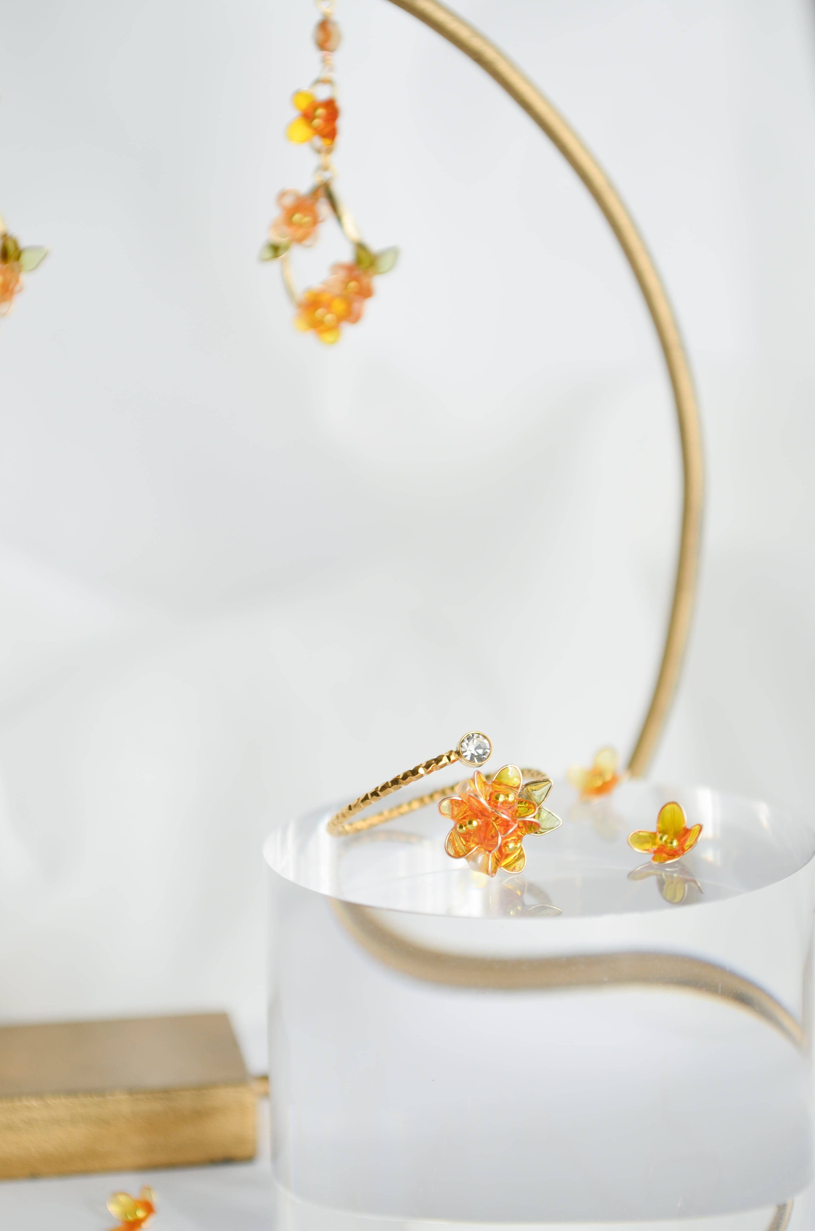 ワイヤーとレジンで再現された柔らかな3輪の金木犀が、まるで陽だまりのように指元を照らしてくれます。